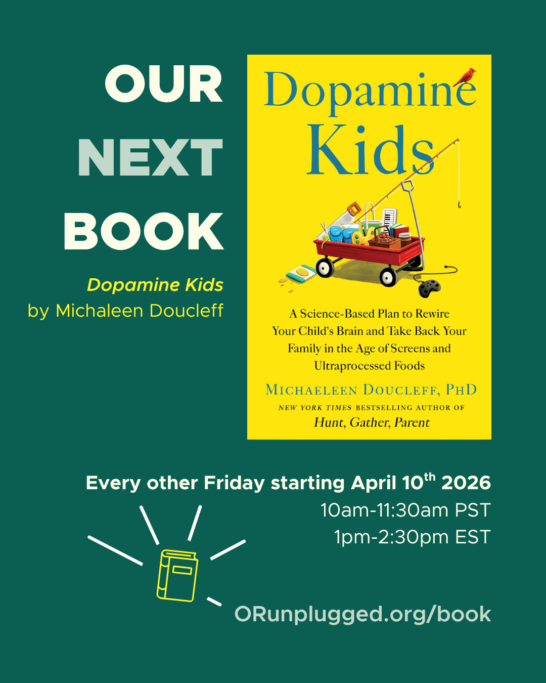 Join us on every other Friday starting on April 10th to discuss Dopamine Kids by Michaleen Doucleff! Doucleff offers readers a five-step guide to raising confident, happy kids while breaking the cycle of overdependence on screens and other sources of unnaturally high dopamine. Meetings will be held every other Friday at 10am PST (1pm EST).