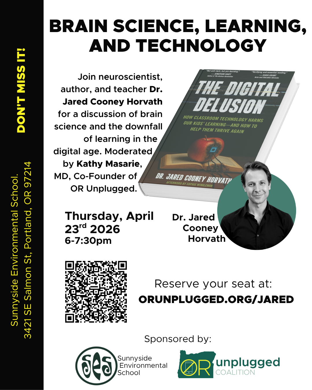 Join us Thursday, April 23rd from 6-7:30pm at Sunnyside Environmental School (3421 Southeast Salmon Street. Portland, OR 97214) to hear Horvath talk about brain science, learning, and technology through the lens of his experiences as a neuroscientist, parent, and educator.